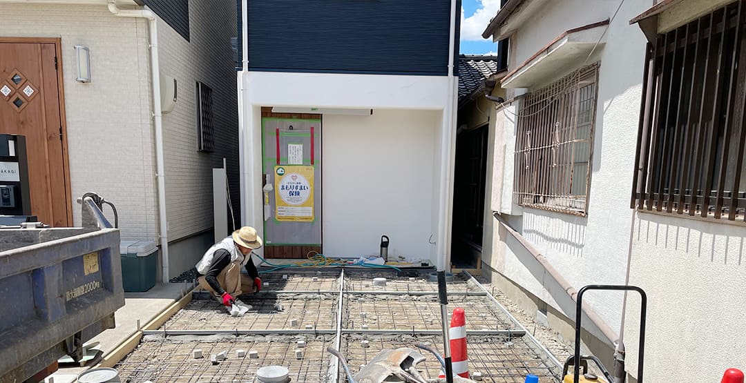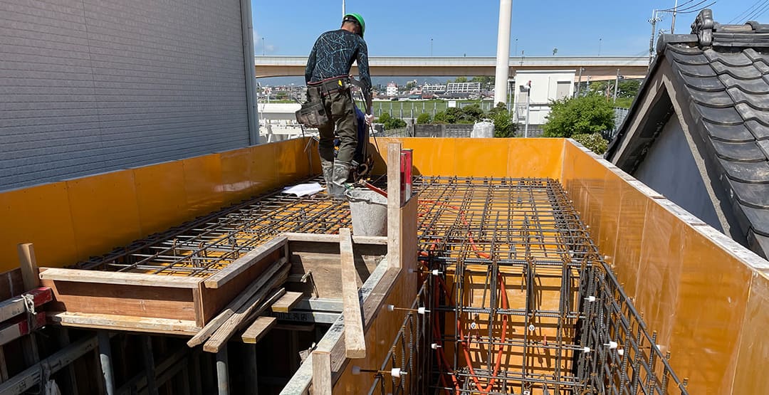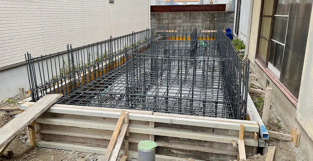限られたスペースの中で、水平精度と配筋の整合性を保つことが最重要課題。ミリ単位での施工管理により、後の上棟に向けて構造の芯を確立しています。