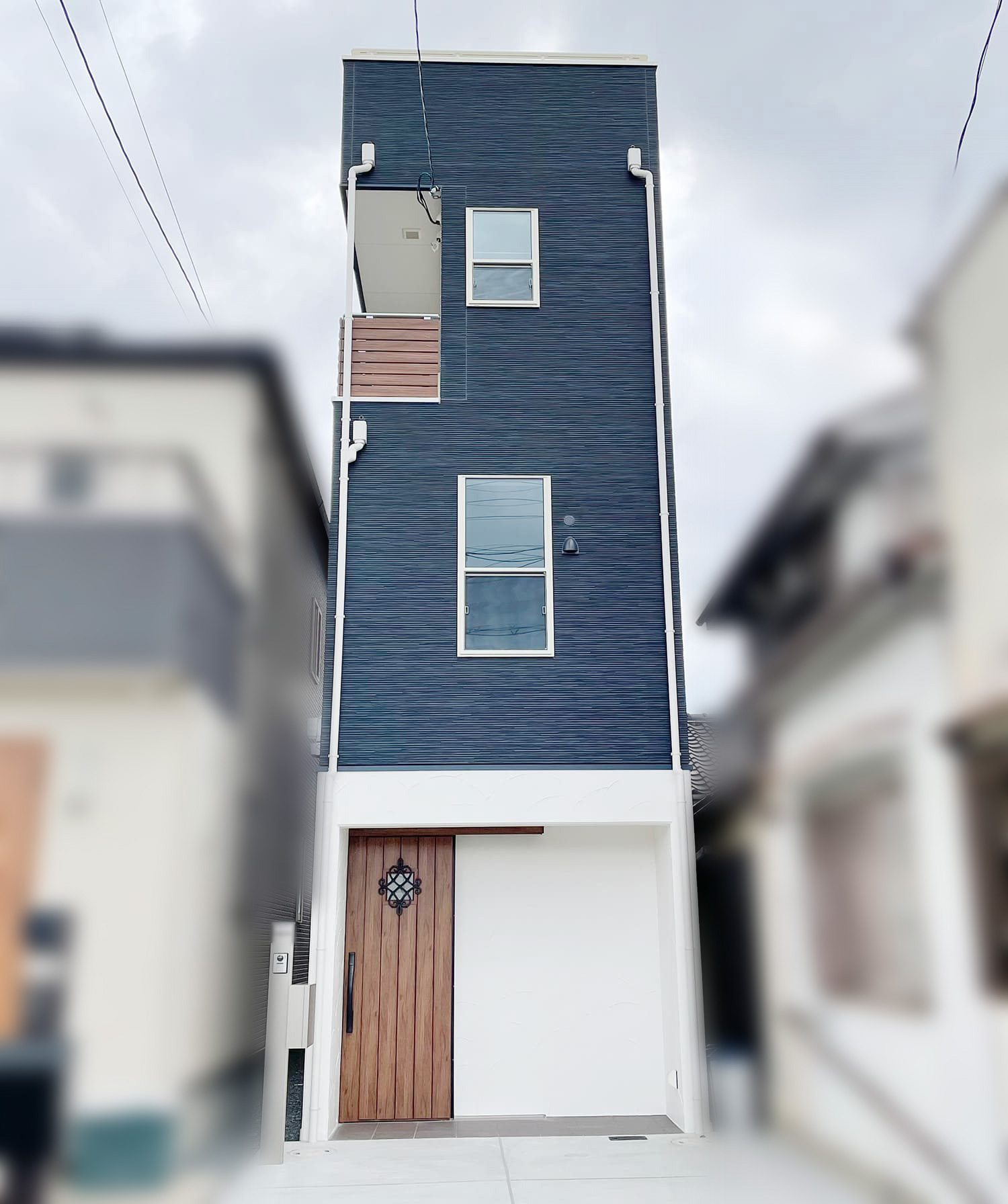 外壁はサイディングと吹付仕上げの組み合わせで、周囲の街並みに調和しながらも独自の存在感を放つデザインに。