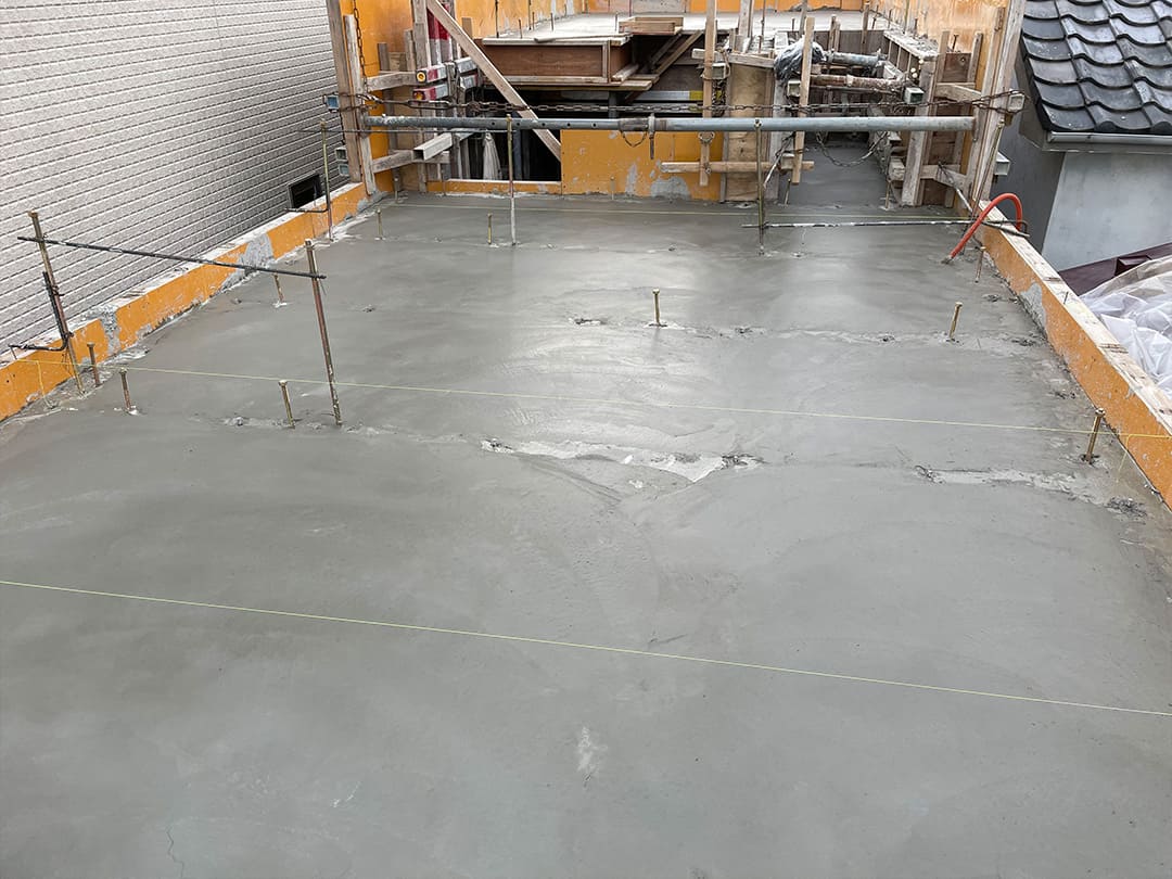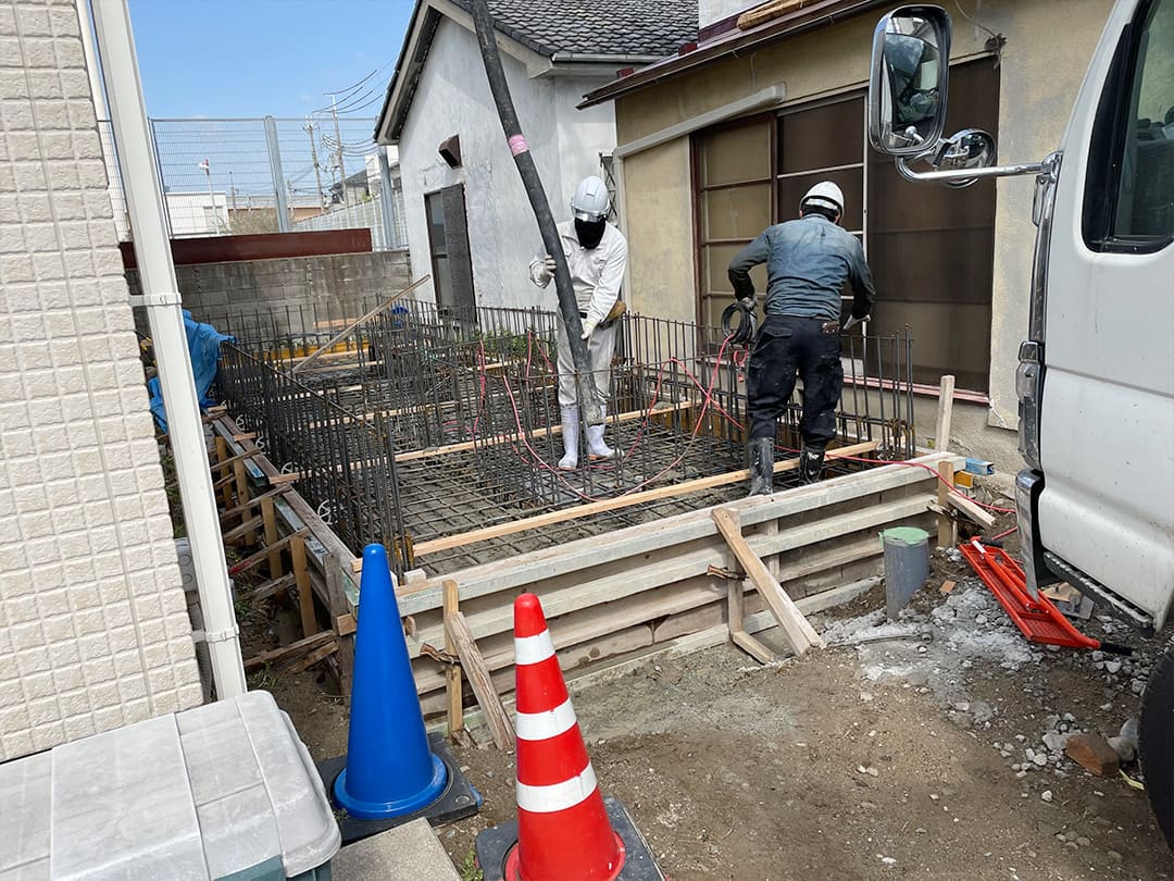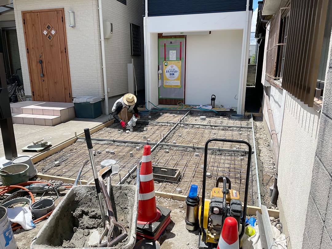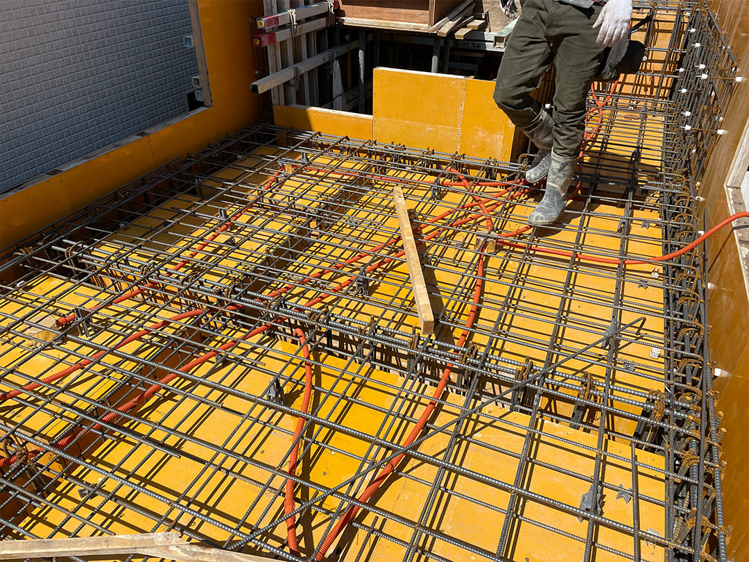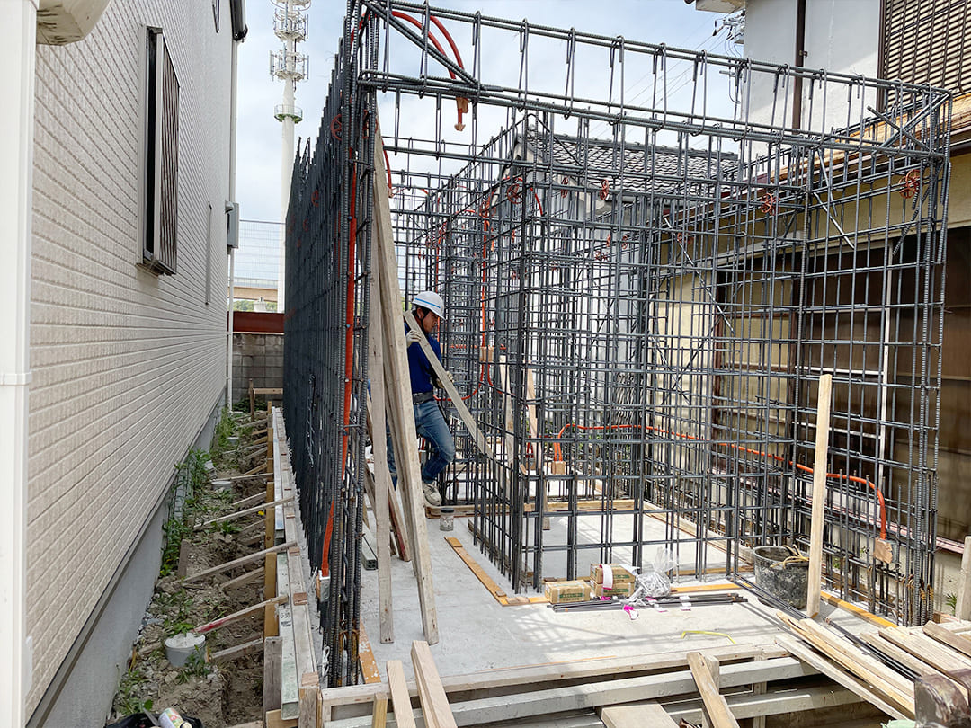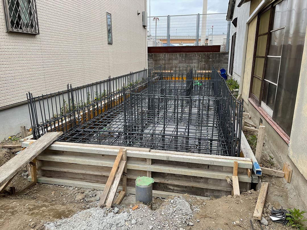 限られたスペースの中で、水平精度と配筋の整合性を保つことが最重要課題。ミリ単位での施工管理により、後の上棟に向けて構造の芯を確立しています。